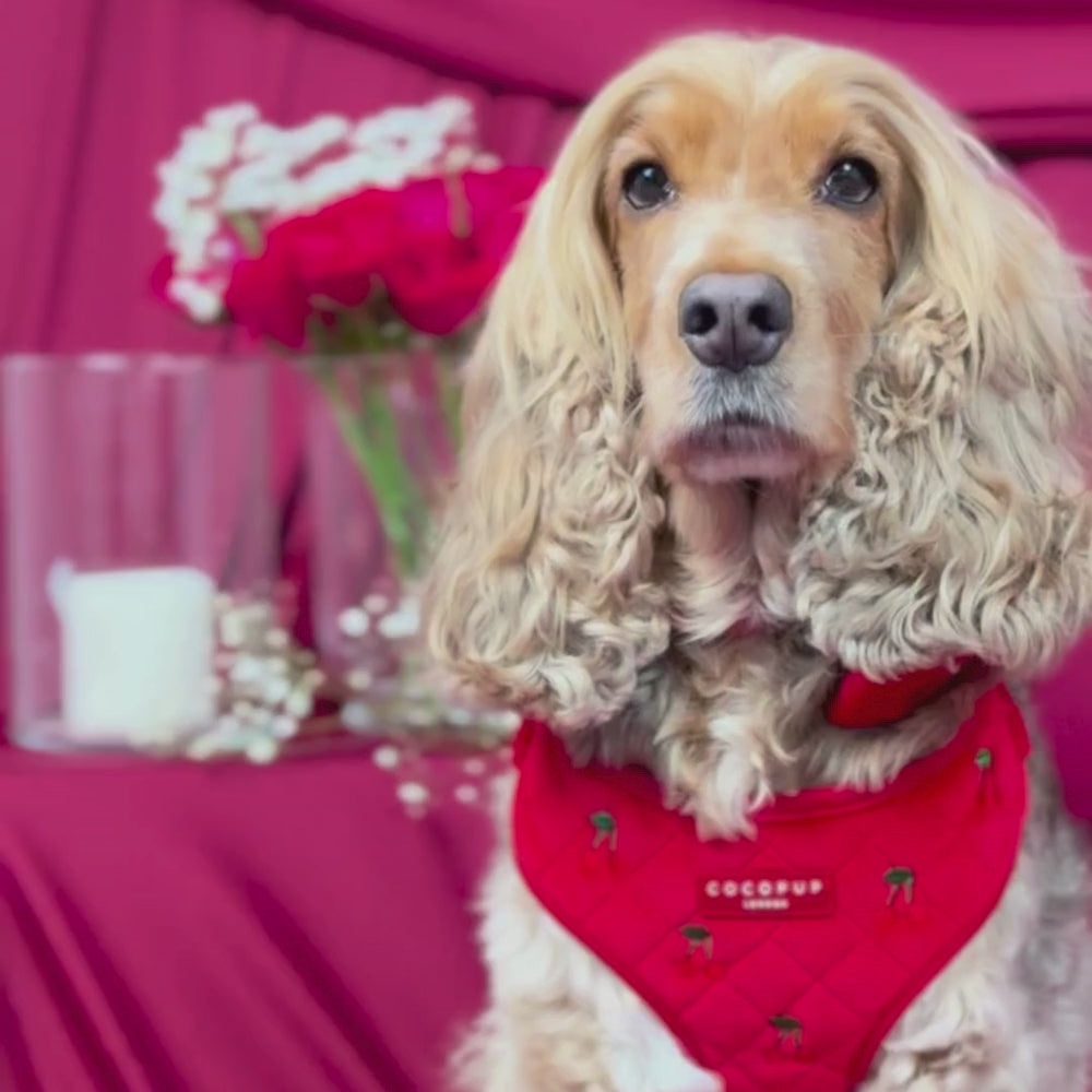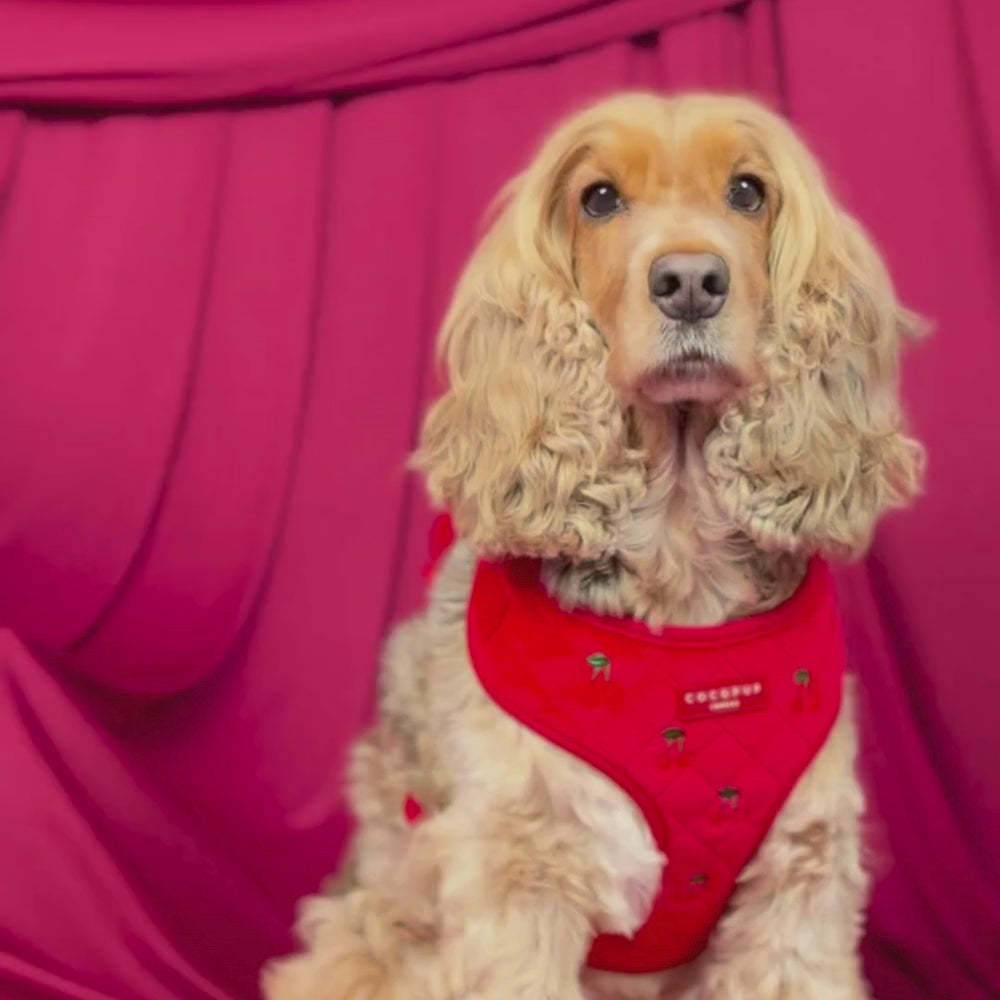 Get ready to turn heads on every stroll with the Cherry Velvet Crush Adjustable Neck Harness! This delightful design pairs lush red quilted velvet with adorable embroidered cherries for a look that's equal parts sweet and chic. Whether you're celebrating Valentine's Day or simply want your pup looking picture-perfect, this adjustable harness delivers comfort without compromising on style. Your furry friend will be the cutest cherry on top!