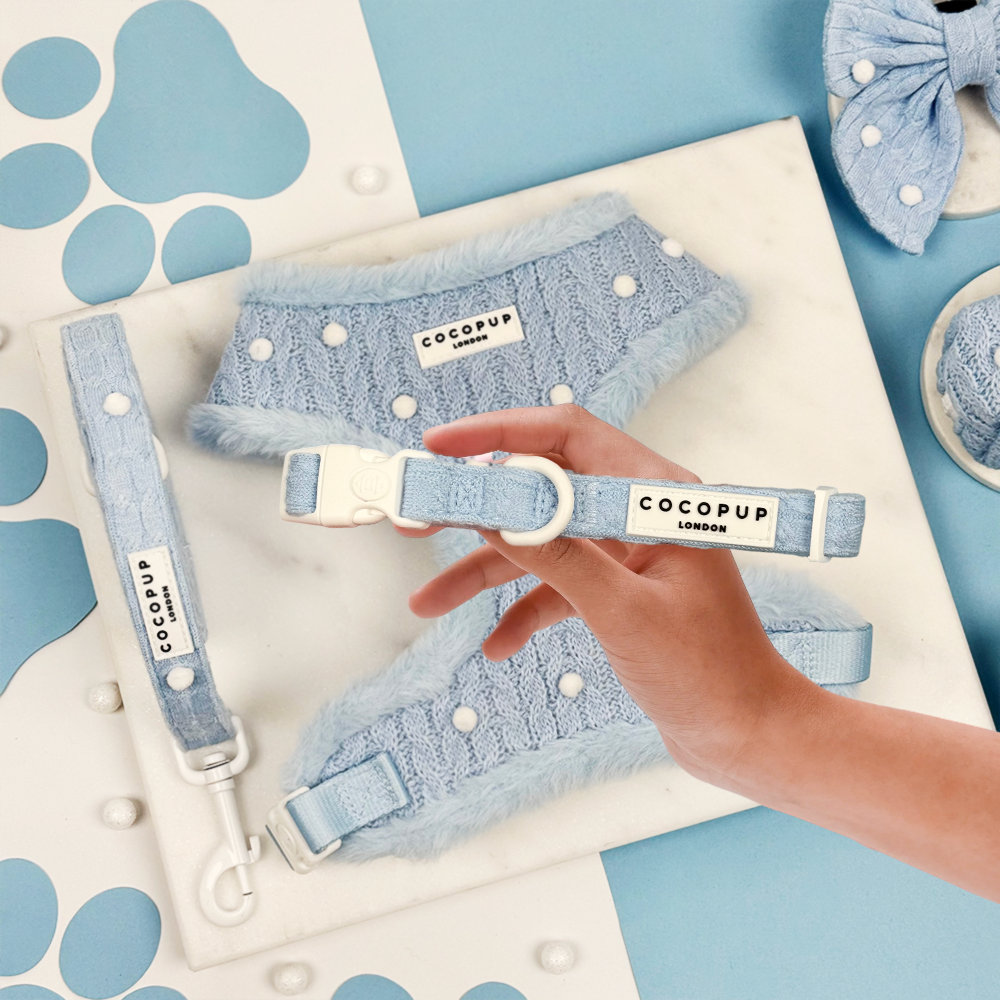Keep your furry friend cosy and secure this winter with the Snowpaws Collar. Crafted from soft blue cable knit material, it adds a charming touch to every dog walk. The safety lock on the buckle ensures a snug fit, giving you peace of mind while your pup explores the chilly outdoors. Perfect for playful adventures in the cold!
