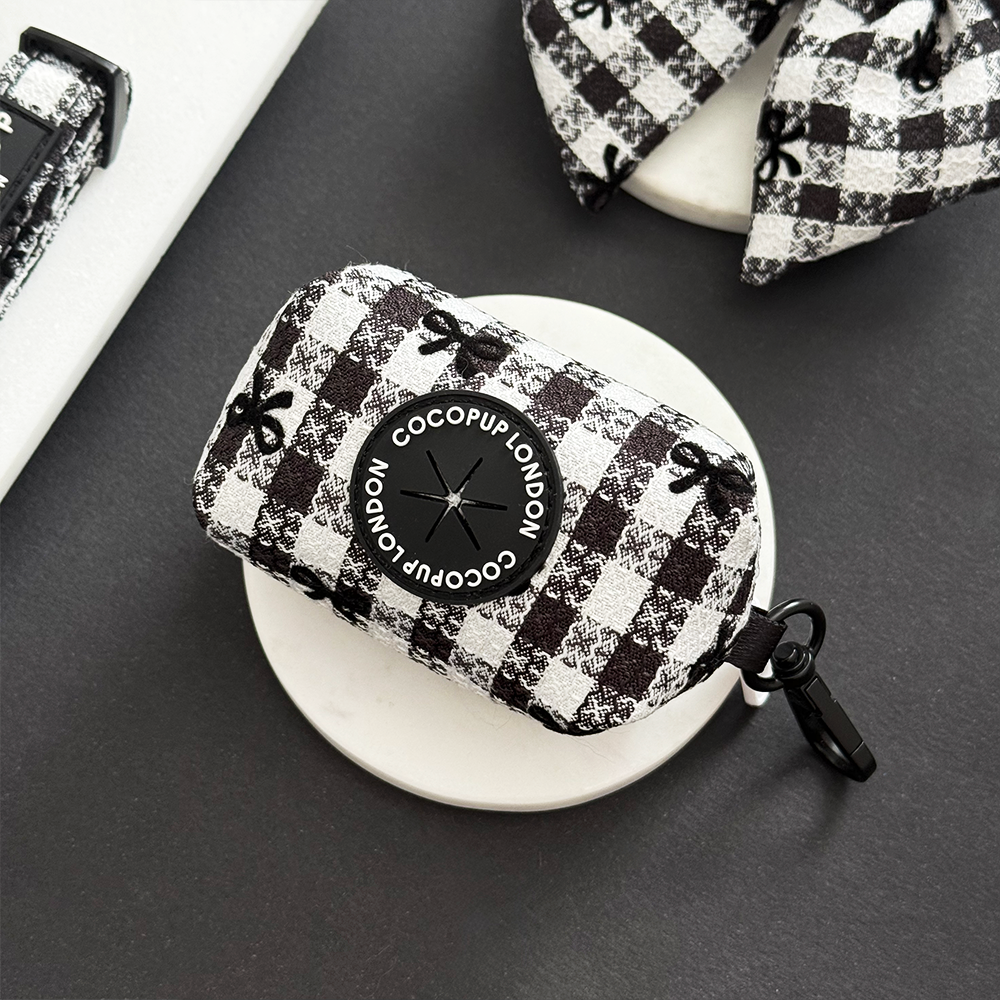Take your pup for a walk in style with our Pup in Paris Poop Bag Holder. This chic black and white checked design features embroidered bows, adding a touch of glamour to your dog walk. This poop bag holder is both functional and fashionable. Woof!