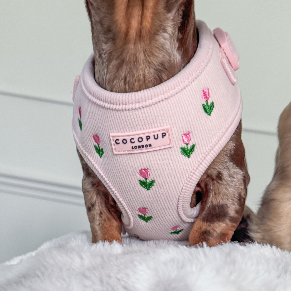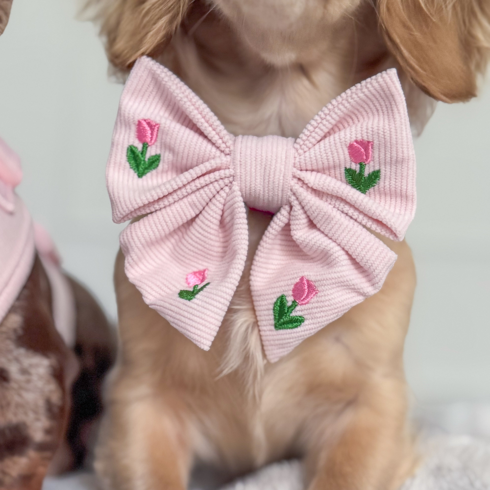Brighten your pup's wardrobe with the Tulip Tails Sailor Bow Bow Tie, a charming accessory perfect for spring and summer adventures. Featuring delicate embroidered flowers in soft pink tones, this adorable bow tie adds a touch of floral elegance to every dog walk. Whether you're strolling through the park or capturing Instagram-worthy moments, your furry friend will turn heads with this sweet, garden inspired style.