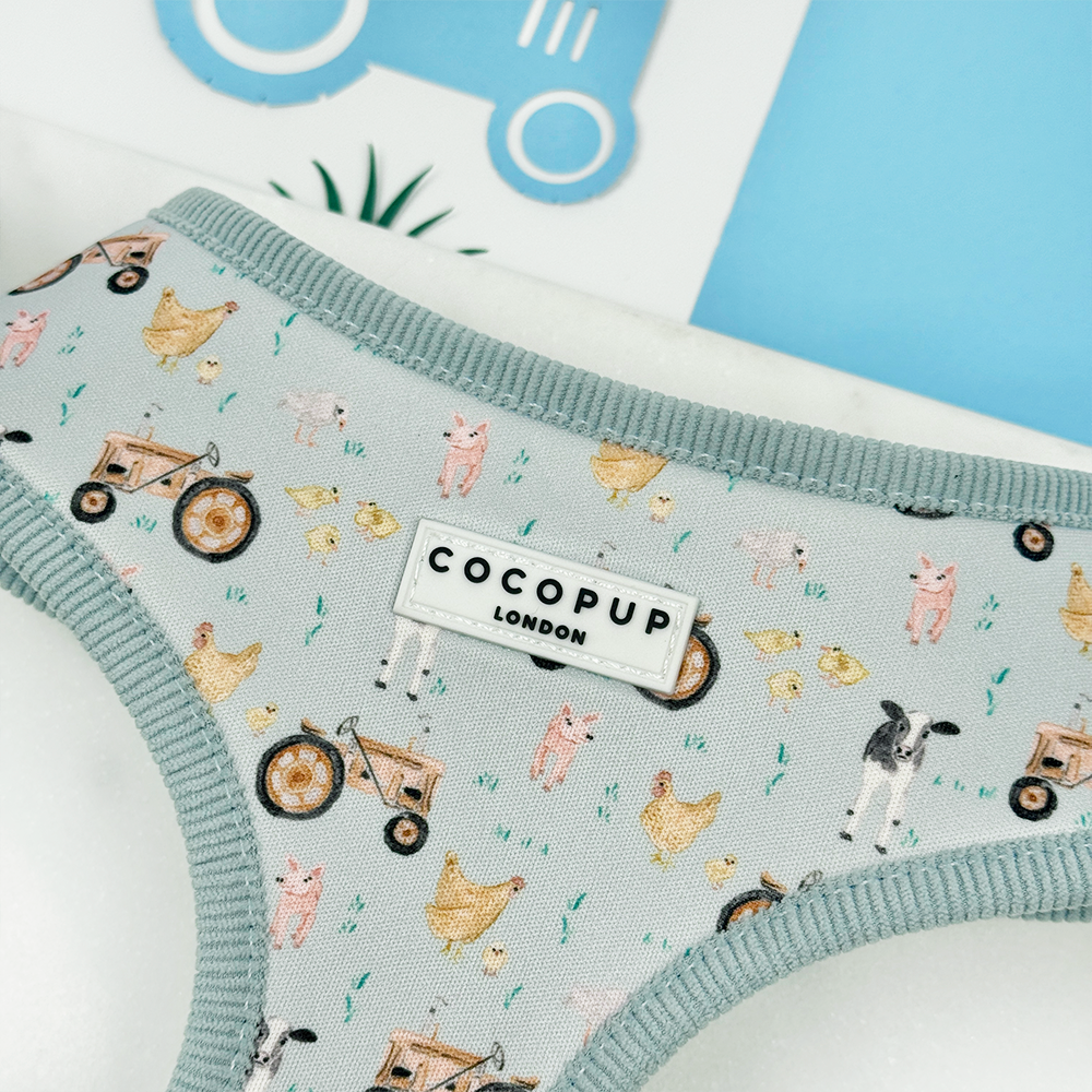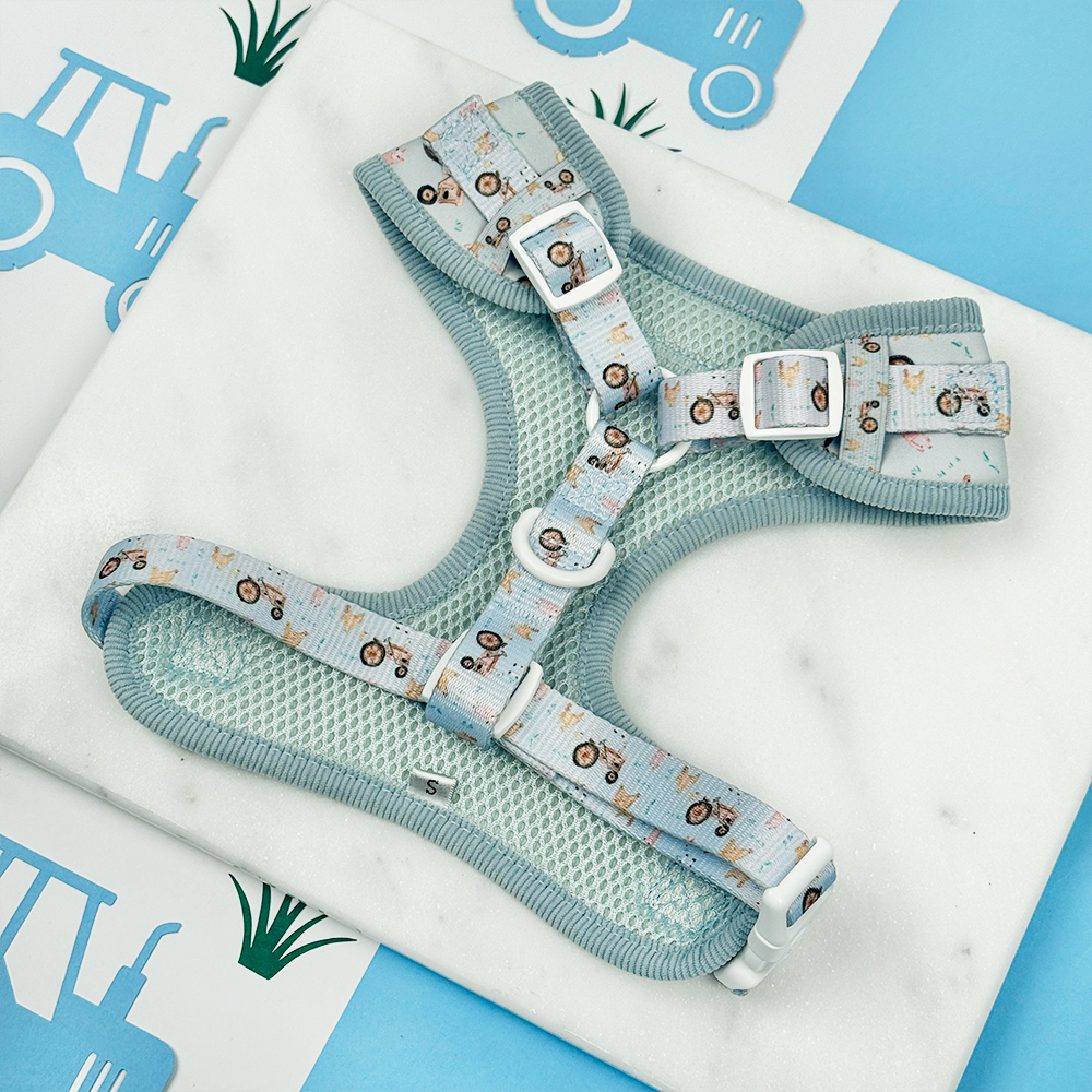 Gear up your farm loving furry friend for springtime countryside adventures with our Barnyard Buddies bundle! This delightful collection features a cheerful blue harness, lead and collar set, each piece adorned with farmyard characters - tractors, cows, pigs, ducks and chickens. The adjustable design ensures comfort and security on every walk, whilst the charming pastoral illustrations celebrate your shared love of rural life. Whether trotting through country lanes or exploring open fields, your pup will look absolutely adorable whilst staying safe and secure!