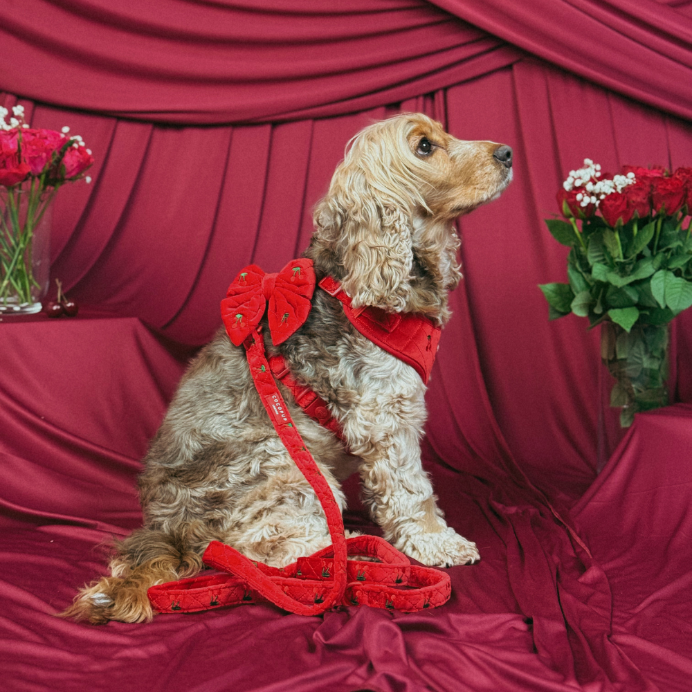 Created from sumptuous red quilted velvet with delicate embroidered cherries, this sweet accessory brings Valentine's charm to every dog walk. Perfect for special occasions or everyday cuddles, because every moment deserves a little extra sweetness!