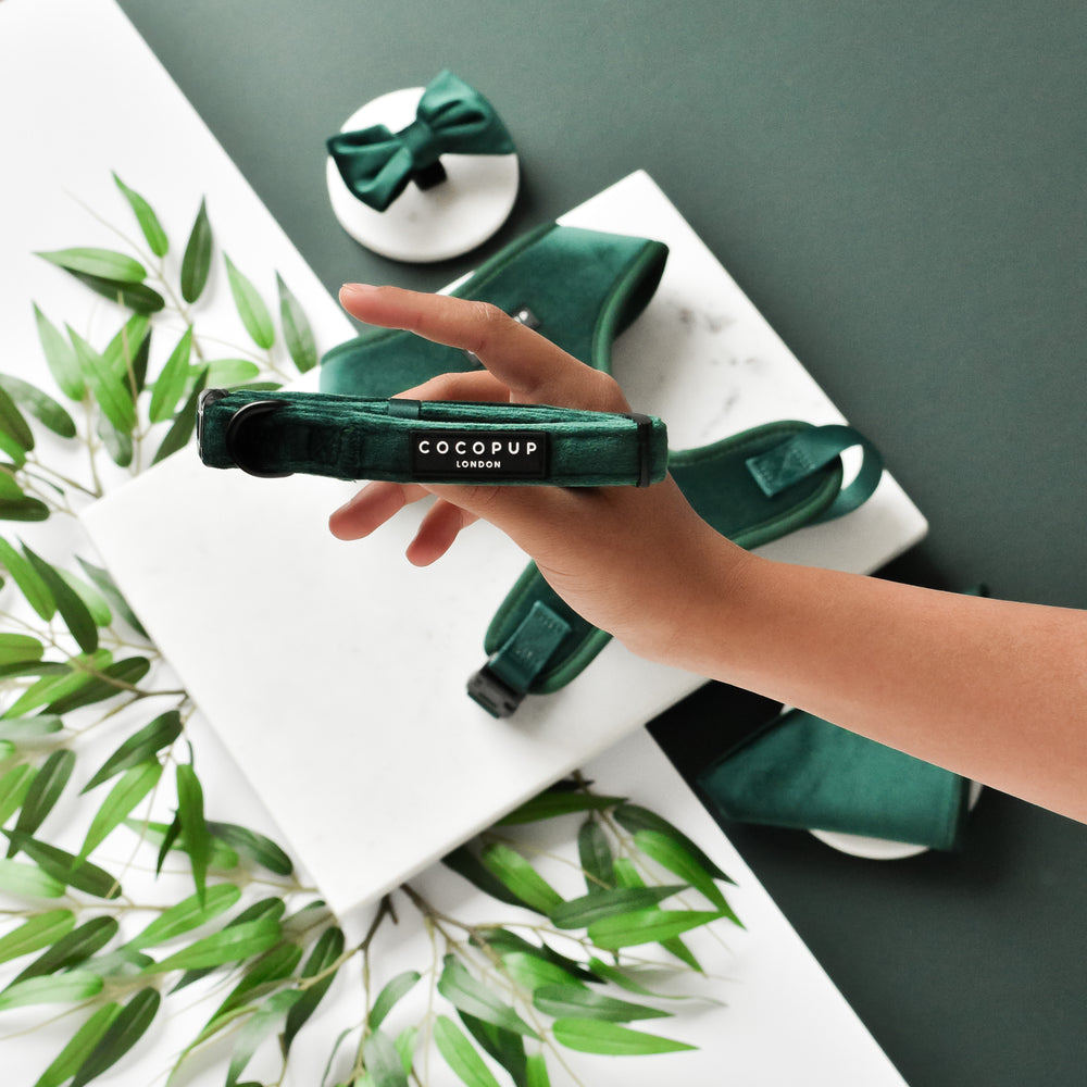 Luxe Velvet Adjustable Neck Harness, Lead & Collar Bundle - Forest Green