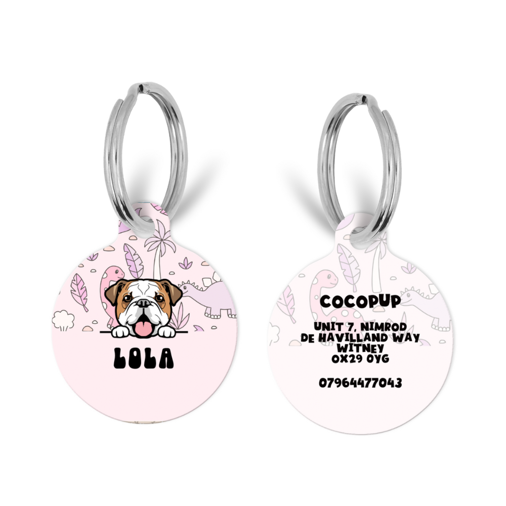 The dog ID tag is double sided, the front features our Princess Dino design with a super cute cartoon version of your doggo along with their name. On the back we can print key important information such as your last name, address and phone number. Our ID tags will ensure your pooch can strut its stuff in style.